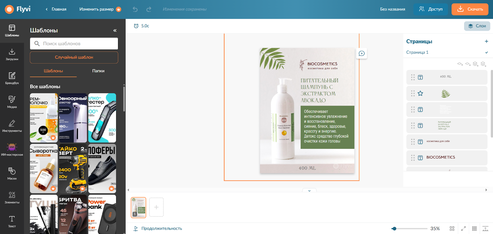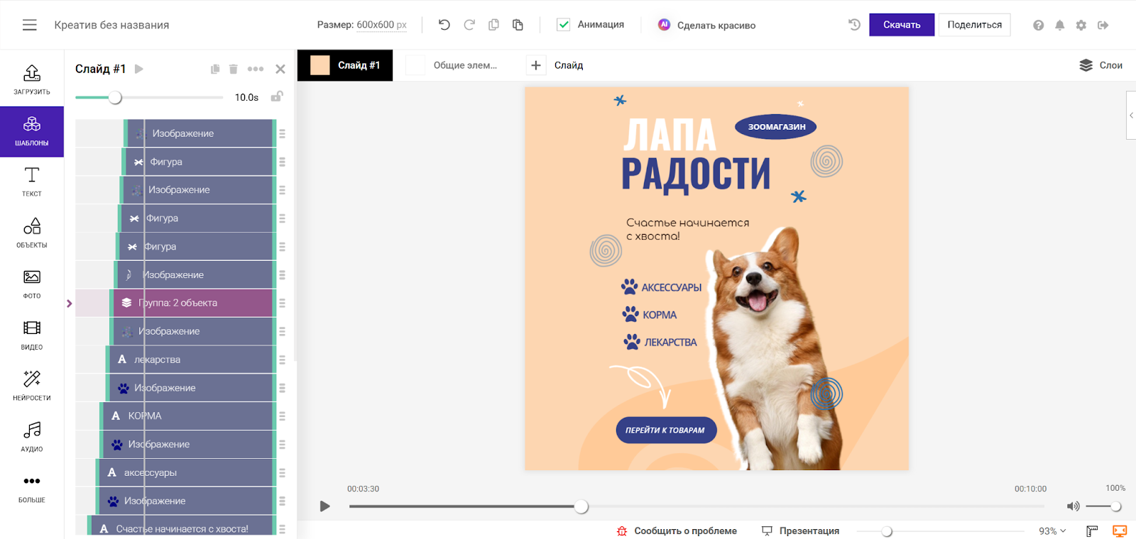 SUPA — российский аналог Канвы, в том числе в части создания рекламных роликов. Сервис предлагает большой выбор решения для маркетплейсов, бизнеса, социальных сетей и видеохостингов. В онлайн-конструкторе можно не только воспользоваться шаблонным вариантом, но и создать визуал с нуля при помощи инструмента Supa Magic. Нейросеть формирует уникальный пользовательский дизайн на основе загруженных иллюстраций и текста.