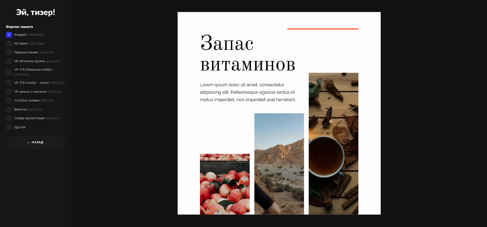 Если вы в поиске бесплатной альтернативы Canva, то обратите внимание на онлайн-редактор «Эй, тизер!». Сервис позволяет создавать посты, тизеры и сторис за минуту, используя готовые шаблоны. Но учитывайте, что редактор ориентирован на соцсети.