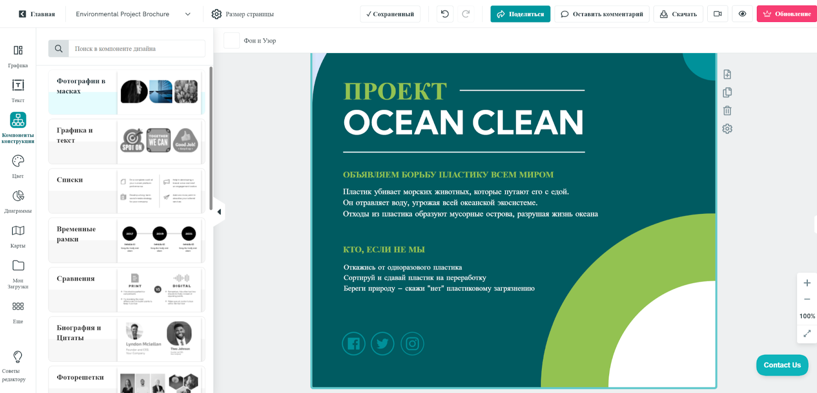 Подходящий вариант замены Canva для решения бизнес-задач. Сервис специализируется на инфографике и презентациях. Благодаря готовым стилям, разнообразным цветовым палитрам и продуманному расположению элементов здесь легко превратить сухие данные в яркие и запоминающиеся материалы.