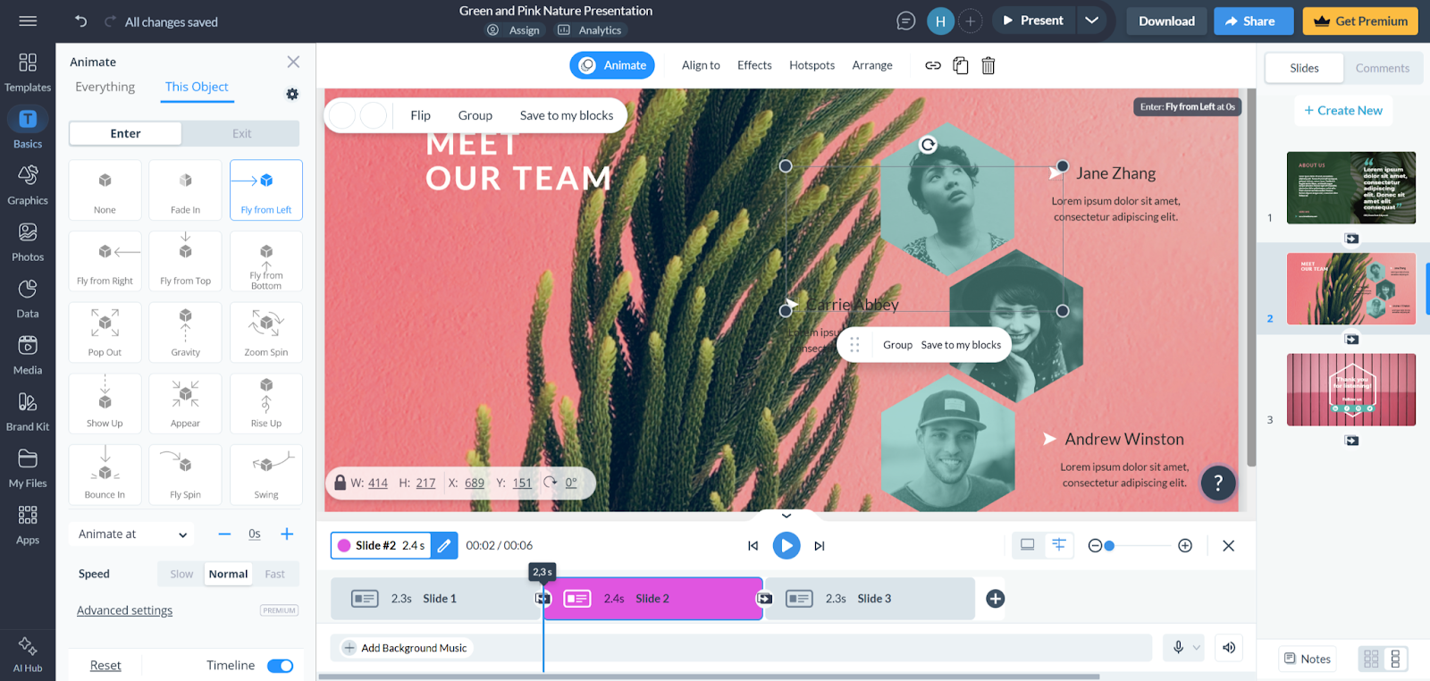 - много эффектов для анимации, ручные настройки параметров как для одного элемента, так и для выбранной группы компонентов;