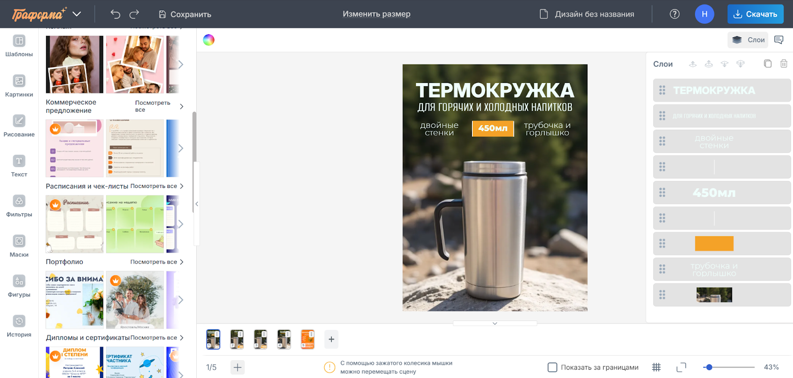 Граформа — новый продукт от отечественного разработчика. Здесь можно бесплатно воспользоваться шаблонами, скорректировав их под собственные нужды. Сервис полностью на русском языке.