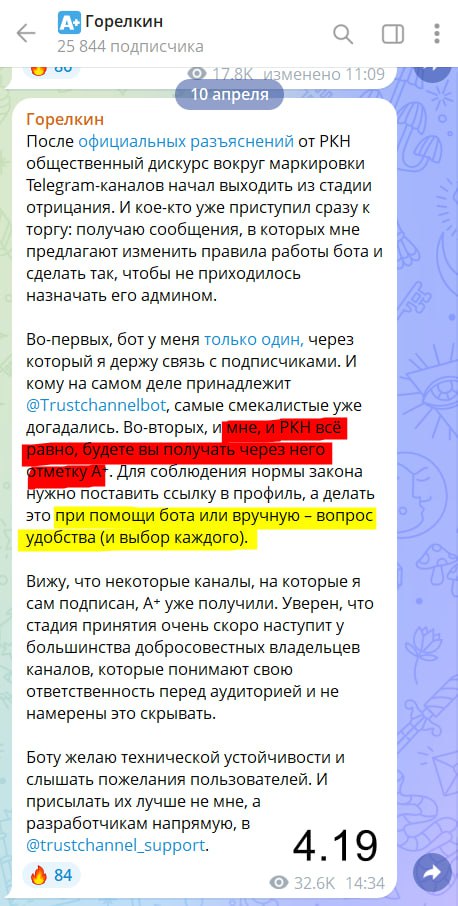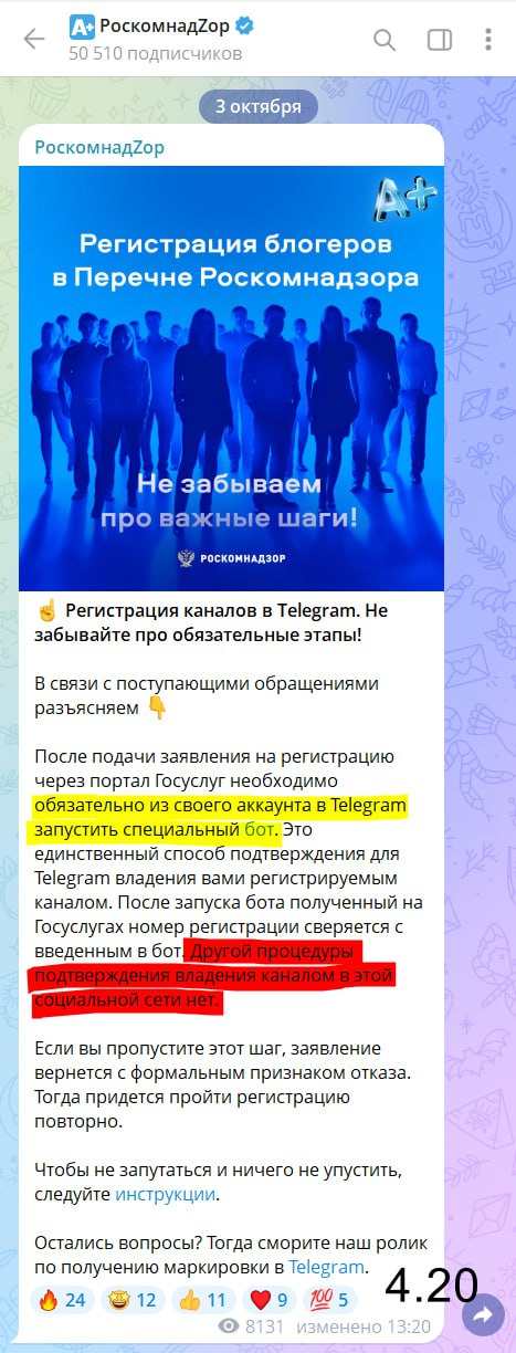 Владельцы крупнейших российских Telegram-каналов теряют контроль над своими площадками. На это обратил внимание популярный блогер BadComedian, сообщив, что Роскомнадзор перешел от предложений к ультиматумам. Теперь каждый канал с аудиторией свыше 10 тысяч подписчиков обязан не просто зарегистрироваться, а назначить государственного бота своим администратором. Выбора больше нет.