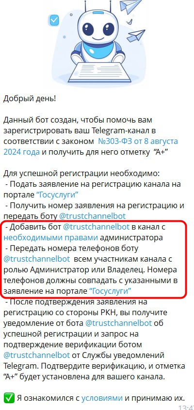 И ладно бы просто бота. Ему нужно выдать права на «изменение профиля канала» и «добавление участников». Давайте на секунду задумаемся, что это значит на практике. Право «изменять профиль» — это не просто смена аватарки. Это возможность в любой момент переименовать канал, удалить описание или разместить дискредитирующую ссылку. А право «добавлять участников» потенциально позволяет размывать аудиторию ботами или внедрять «своих» людей. По сути, это как дать постороннему человеку право не только входить в вашу квартиру, но и менять табличку с фамилией на двери и решать, кто еще может сюда зайти. Вдобавок, владелец и абсолютно все администраторы канала обязаны передать боту свои личные номера телефонов. Прямо в чат. Это не просто формальность, а полная деанонимизация, привязывающая цифровую личность к реальному человеку, его паспорту и месту жительства.