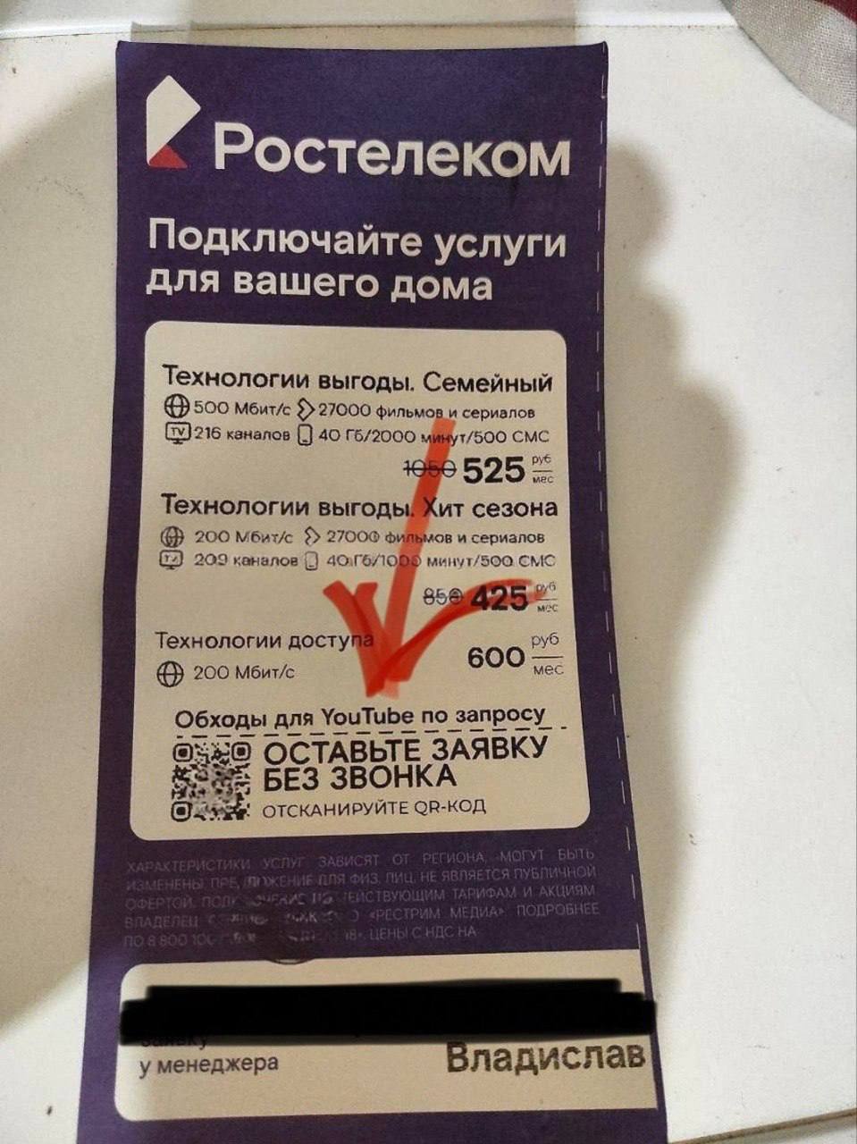 На рекламной листовке Ростелекома среди стандартных тарифов «Технологии выгоды» появилась отдельная строчка про YouTube , указывающей на специальное предложение. Компания не скрывает свои намерения — услуга позиционируется открыто, с QR-кодом для удобства заказа. Впрочем, пока не совсем понятно, является ли рекламная листовка официальным предложением провайдера или она была отпечатана самостоятельно. Никаких комментариев на данный момент Ростелеком не давал. Кроме того, важно понимать, что официально власти России не признают замедление видеохостинга. Позиция чиновников — во всем виноват Google, который отказывается обслуживать собственную инфраструктуру в России и вовремя чинить кэширующие сервера YouTube.